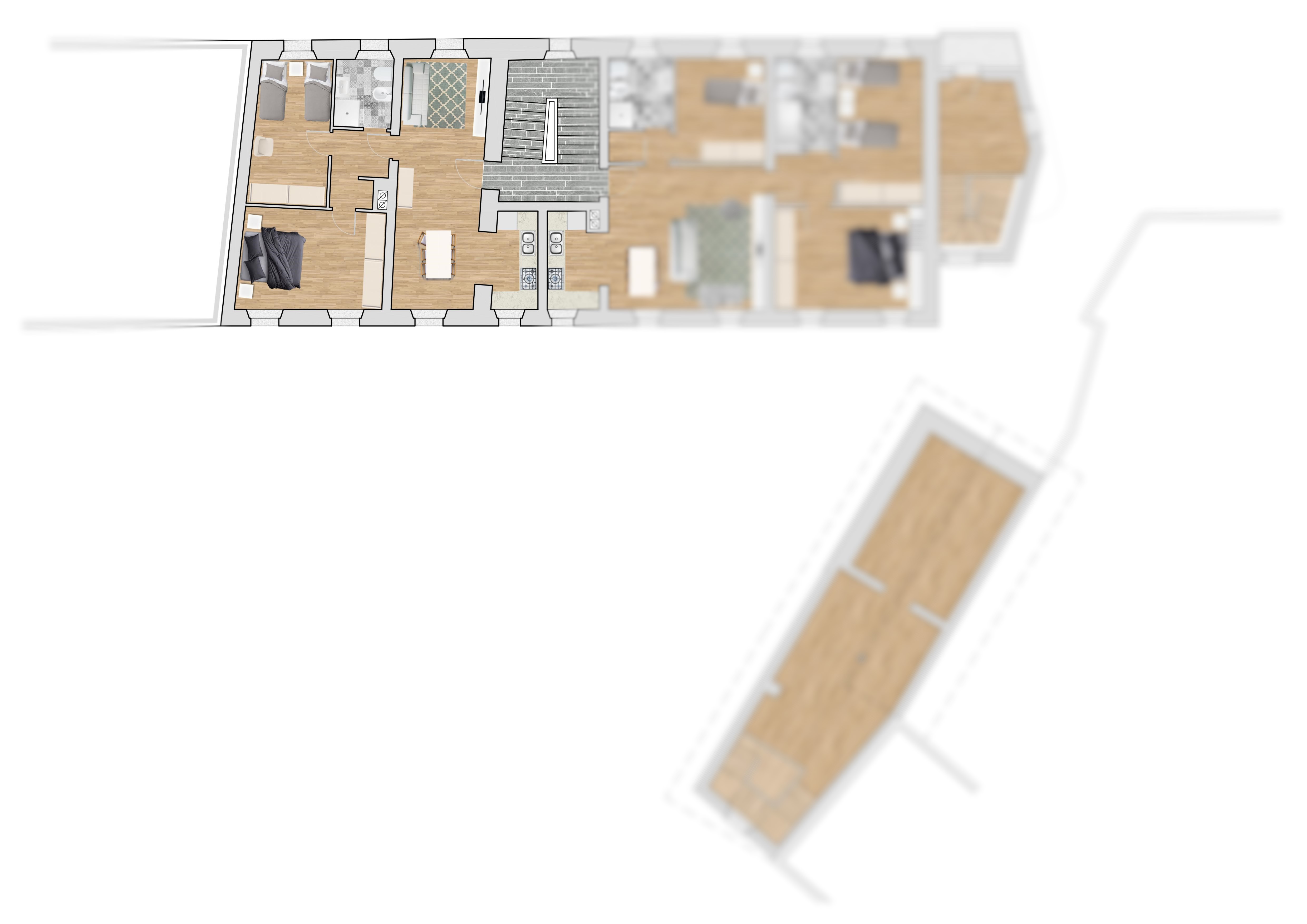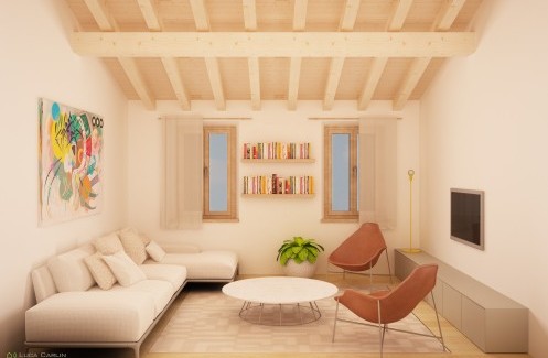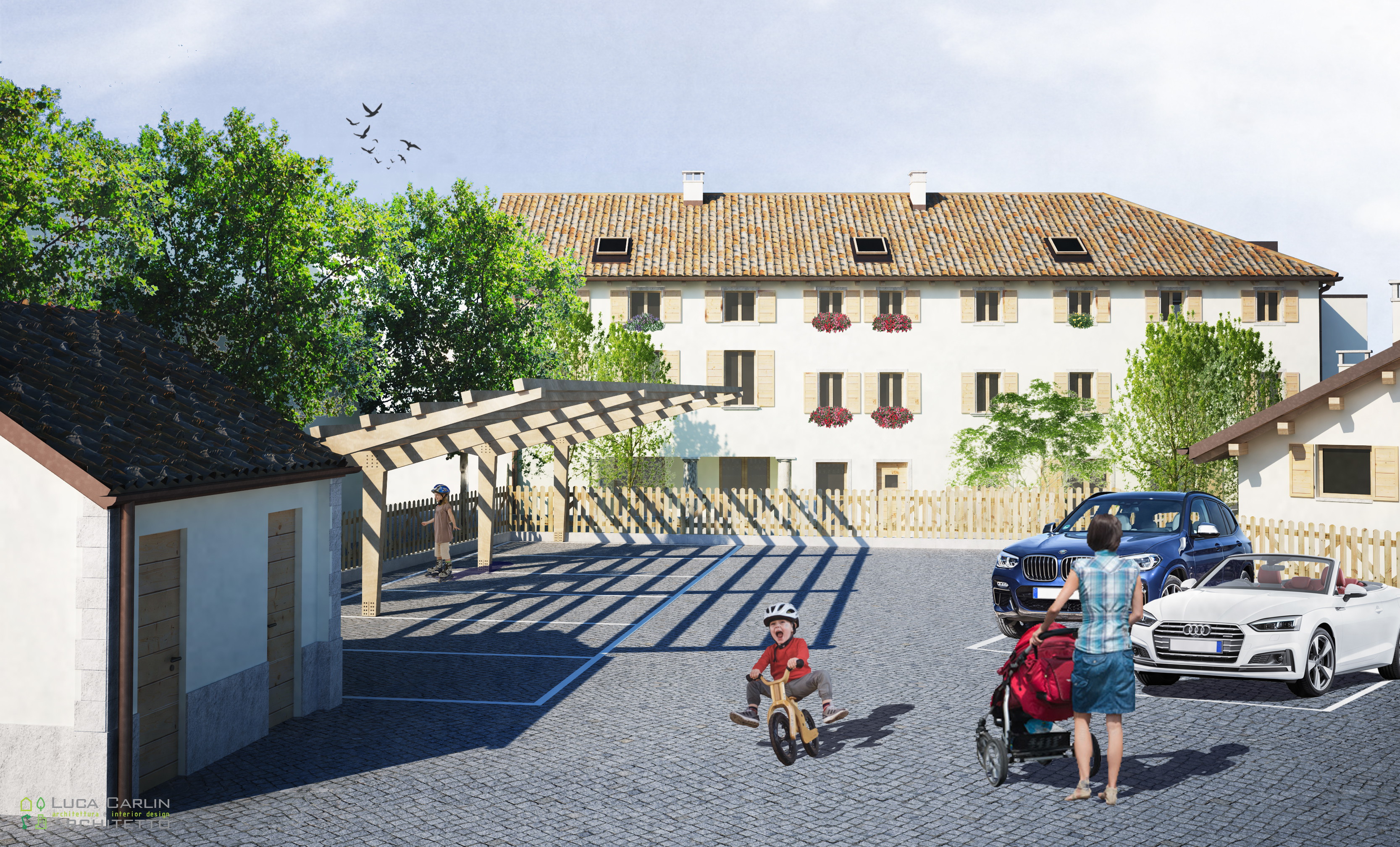 L'appartamento, che può essere ancora personalizzato a seconda delle esigenze e dei gusti, è composto da una cucina, un soggiorno, 2 camere e un bagno. Completa l'immobile un parcheggio esterno coperto.